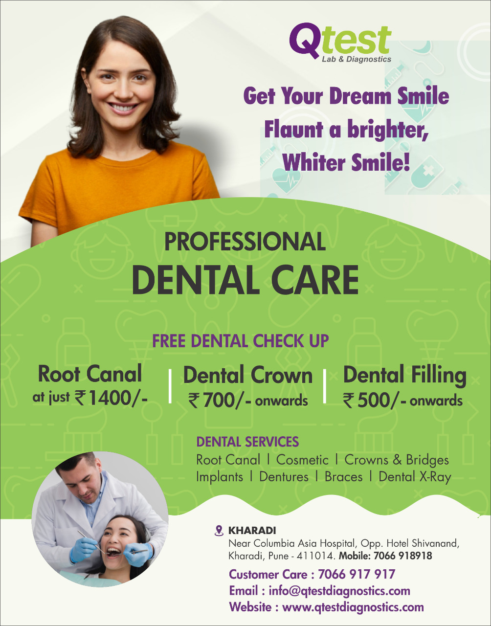 I went to Qtest for my dental treatment. I must say the staff is very accommodating, the place is very clean and hygienic. Dr diagnosed my treatment very well; she is friendly and made me comfortable with the overall treatment. The instruments are well sterilized and the overall treatment is very hygienic and safe. They are well versed with high-tech machines for the A-class service.